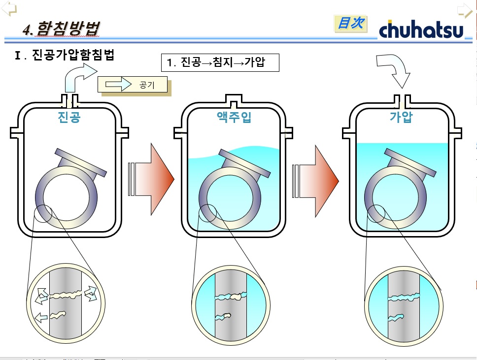 진공-침지-가압법이란, 함침탱크에 워크를 투입한 상태에서 마이크로 단위의 기공안에 있는 공기를 충분히 제거하기 위해 진공을 실시합니다. 그 후 액 밸브를 열면 저장조에서 진공상태에 있는 탱크로 액이 자동으로 이동하게됩니다. 이 때 진공상태에 있는 마이크로 단위의 기공 안으로 함침액이 침투하게 됩니다. 이동이 완성되면 가압 밸브를 열어 액면을 공기압력으로 지긋이 눌러 줍니다. 이 공정은 기공의 모양이나 크기에 따라 진공의 힘으로 함침액의 침투가 부족한 곳을 완벽하게 채워주는 역할을 합니다.